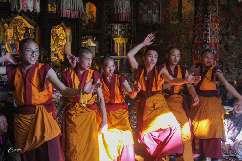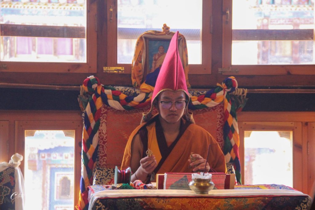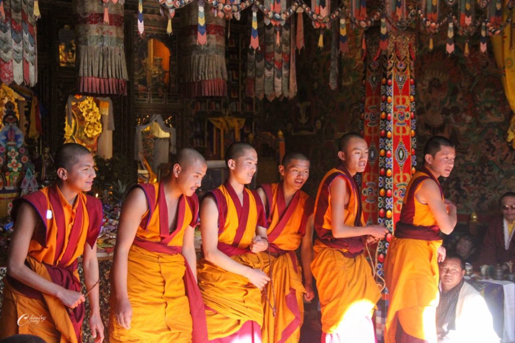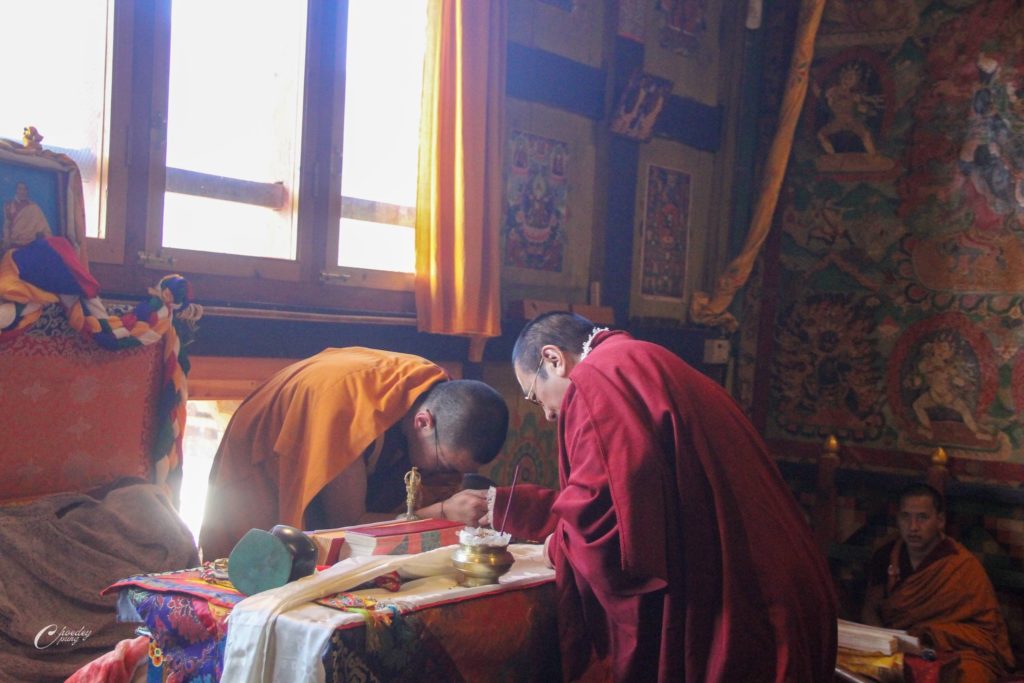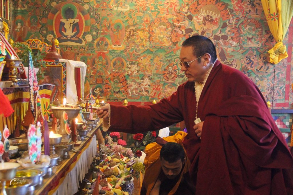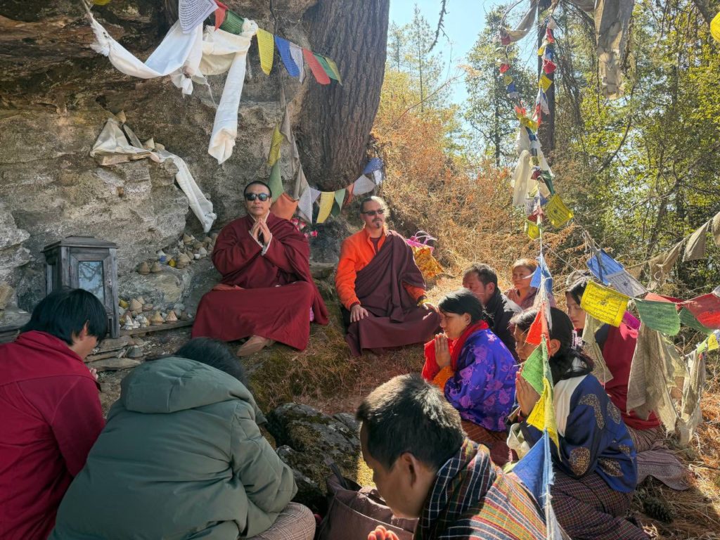 To commemorate the parinirvāṇa of the great master Longchen Rabjam, monks from Choedaypung Monastery performed a puja presided over by Tulku Shenphen. Meanwhile, His Holiness Tang Rinpoche and a small group of students went to meditate in Longchenpa’s cave. During the meditation, Rinpoche reported receiving a pure vision, through which he wrote down a treasure text.